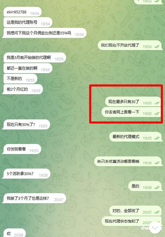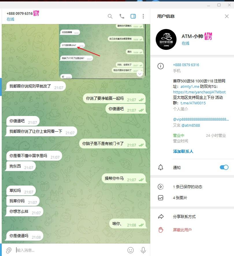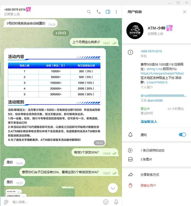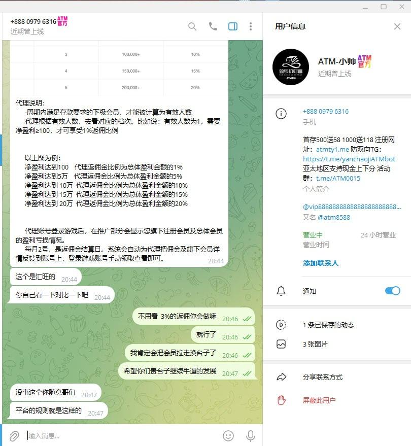 我是3月就在ATM做的代理,当时都是谈好的55%返佣,直到7月中旬后说变动了,当时咨询问了说是5个活跃30%,现在开始玩文字游戏了,30%的返佣还要配合你代理的净输赢达到30W+的情况下才能领取,试问这不就成了3%的返佣政策了吗?3%的返佣模式有代理会去推广吗,一个给你推广平台带来输赢的代理还比不上你们一个员工拿的返点多,实在是高招,不知道是不是平台杀一波要跑路了 ,现在我已经把会员都转移了,希望各位代理玩家避雷。