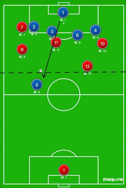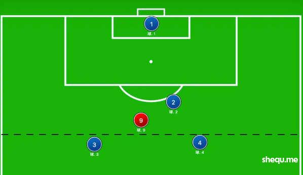 如果在这条传球路线上加一个中后卫,红10就得起高球找红9了,后者还是可以拿到大把射门机会。
