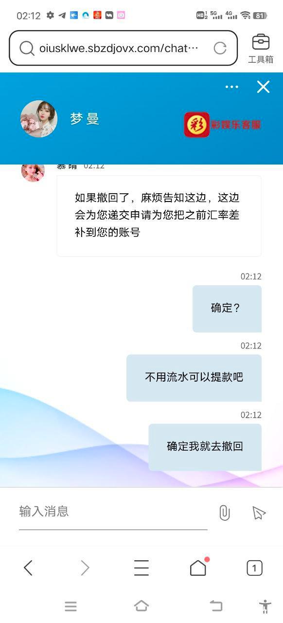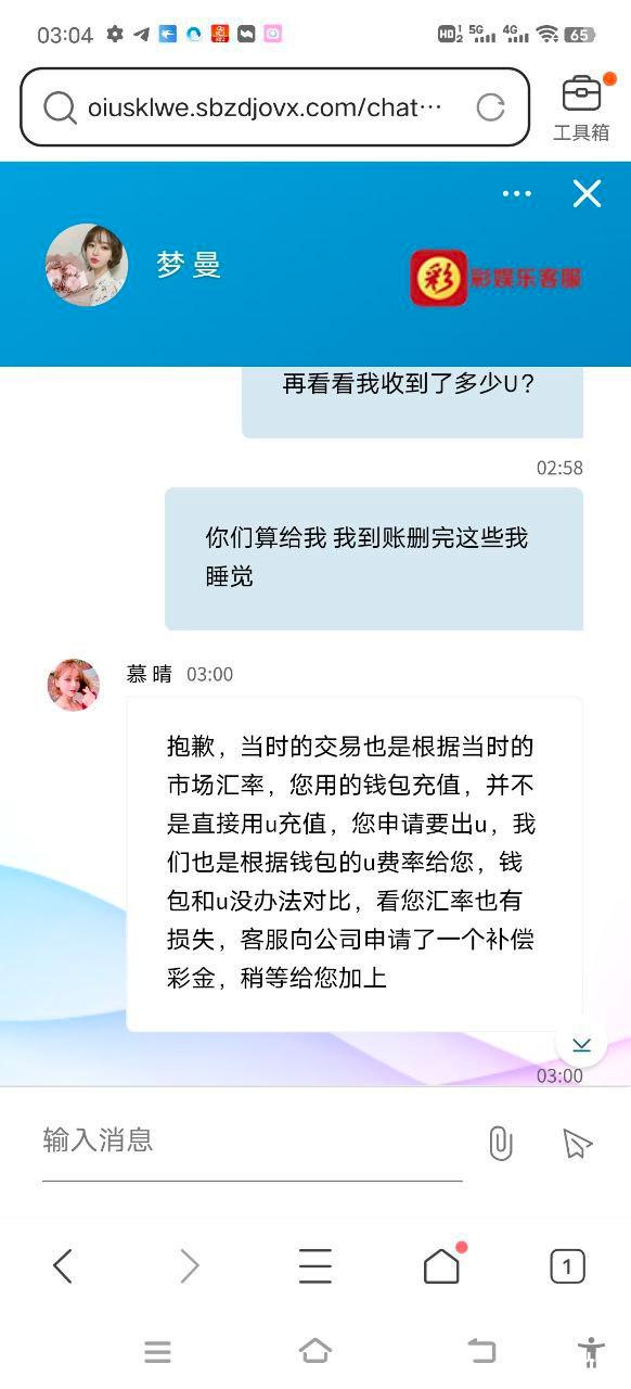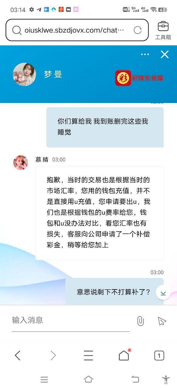 在你们平台注册玩了好几年老玩家了,还注册了代理拉了二十多个朋友一起来这玩,前前后后输了六七十万,六月份由于之前一直用支付宝充值提款,前前后后换了好几个支付宝都被限制了,微信也限制收款了,最后一次用to钱包买币充值,赢了申请提款u,当时汇率不过7.30左右,我也把情况跟客服解释了,我确实没有别的收款方式了,结果黑客服联合出款财务按照7.76-7.8给我出款,当时我是没有选择给这帮黑心的客服趁火打劫前后提款七八笔,光是手续费扣了我一万多了,然后通过曝光又说补回我这几笔手续费,最后就补了一笔两千的手续费给我,剩下就开始叫我配合撤回曝光,结果我这边说要给完剩下的就两清,结果立马变卦,换了副嘴脸就说剩下扣我的手续费不补了,希望看到的朋友还在玩彩娱乐的注意避坑,这帮畜牲别的事不干,但是逮到你机会就想从你身上捞一笔。